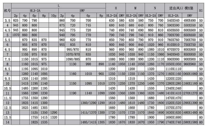 風(fēng)機(jī)選用HL3- 2A或SWF系列風(fēng)機(jī),性能參數(shù)依照HL3-2A或SWF系列風(fēng)機(jī)中同型號(hào)的性能參數(shù)。