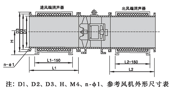 五、HTF型風(fēng)機(jī)配帶消聲器外形尺寸表