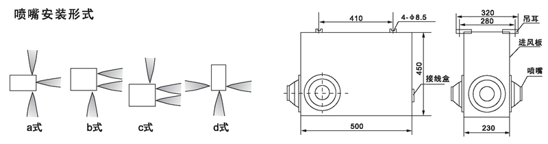 球形噴口立式誘導(dǎo)風(fēng)機(jī)由離心式通風(fēng)機(jī)、消聲機(jī)箱、三個(gè)萬向球形噴嘴組成,回轉(zhuǎn)角度<60* ,噴口φ80X3;